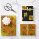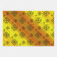 Three styles of hand-drawn fractals, including Sierpinski triangles, Apollonian gaskets, and a similarly themed square design, make up the layers of this geometric mandala, overlaid onto a bright yellow and orange gradient. Two sheets in this set feature the fractal mandala scattered across a bright yellow and orange gradient background, while the third sheet features a pattern of the fractal mandalas on a black background to give you options and variety for your gift wrapping or DIY projects.