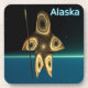 A brown-toned fractal image suggesting a highly-stylised Inuit hunter, wearing traditional fur clothing, holding a harpoon with an ivory head. The image is superimposed on a background depicting the dark polar winter. Text reading "Alaska" appears in glowing blue and white.