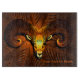 Multiple fractal images combined to form a colourful ram's head on a background which looks like carved wood. Add you own text.