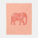 Fleece blanket in a digital graphic of a richly embellished elephant. in a swirl pattern in shades of pale to deep coral orange accented with white, on a soft peach / pastel coral background