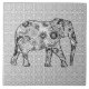 Mixed pattern digital graphic of a richly embellished elephant against an arabesque tiled background - Fractal swirl pattern in black, white and shades of grey / grey against a silver grey background