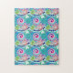 Puzzle in a fractal swirl pattern in shades of blue, pink, green and turquoise, accented with white