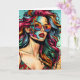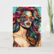 Blank card to just say hi, or for any occasion. Unique ai art depicting a beautiful modern woman with colourful hair and sunglasses in a bikini at the beach with a reflection in them. Pop art comic style fractured art.