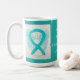 Fragile X Syndrome uses a teal awareness ribbon to show support for its awareness. This custom mug features teal awareness ribbon guardian angel art paintings with the message "I Hope and Support Fragile X Syndrome Awareness!" The custom teal awareness guardian angel ribbon art picture coffee cups or mugs can be customised with personalised messages to make great cause mugs for awareness fundraisers, awareness cup gifts, or other special events or cause support occasions. Make your own customised words for a personal message of hope and support to share!