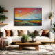 "Fragmented Horizon" portrays a stylised rural landscape, where golden fields and a vivid sky blend with overlaid geometric shapes like floating triangles and vector lines. The composition evokes a sense of time and space being decoded, with the sky resembling digital layers in motion. A central blue stream cuts through the scene, guiding the viewer’s gaze across this hybrid of reality and abstraction.
