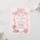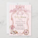 Watercolor pink bow, retro frame, cowgirl hat, boots and wheel on pink striped background. Ideal for a chic, feminine baby shower brunch celebration, this design blends a sweet coquette style with soft, inviting colors.