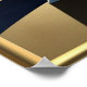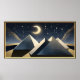 Stylised pyramids, geometric, crescent moon, star constellations, muted gold, navy hues.