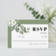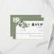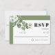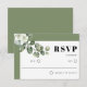 This wedding RSVP card showcases a design with a white frame and delicate white flowers, complemented by a branch of eucalyptus. The sage green borders add a touch of elegance to the overall aesthetic. The upper left corner is adorned with a graceful branch of eucalyptus with white flowers, creating a captivating focal point. The "RSVP" is presented in bold typography, adding a modern and sophisticated touch. The back of the card is adorned with a soothing sage green colour, completing the harmonious design.