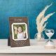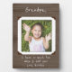 Photo gift for grandparents from the grandkids. Stand-up photo plaque with two places for custom text. Brown wood background design with white, hand-printed font and square photo in the center. Your photo can be any size to fit this template. As long as the subject is in the center, or close, it will work. An old-fashioned photo album frame, in off white, holds the picture of a single grandchild, or many kids. Text at top can be changed to anything, with a short message and signature at the bottom. Choose any size plaque.