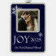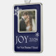 Framed photo ornament is shown in silver tone metal with a deep blue color background and a sample photo, customize this ornament and just change the photo to your own great photo and change the text if you wish with this template.