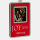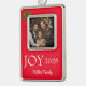 Framed photo ornament is shown in silver tone metal with a red color background and a sample photo, customize this ornament and just change the photo to your own great photo and change the text if you wish with this template.