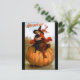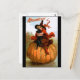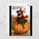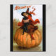 A charming vintage Halloween card featuring a young witch sitting with her black cat on a big pumpkin, painted by the American illustrator Frances Brundage.
