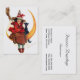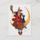 A charming vintage Halloween business card featuring a funny witch and her black cat on a sickle moon, painted by the American illustrator Frances Brundage.