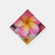 A watercolor sketch painting of frangipani plumeria flowers, painted in pretty shades or pink, yellow, lavender purple and white. Some green for surrounding foliage. Personalise this cocktail napkin with a couple's names, wedding date and personal message. This floral cocktail napkin goes well with a beach, tropical, Hawaiian, or destination wedding theme.