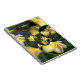 This notebook has a cover featuring a design of tropical pale yellow and cream frangipani flowers against green frangipani leaves.