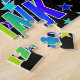This vibrant, fun, birthday-themed jigsaw puzzle design features the message "HAPPY BIRTHDAY, FRANK" with the characters having a colourful rainbow spectrum inspired gradient pattern, along with a lively field of stars background pattern. A vibrant puzzle like this might be used to send a birthday greeting message to somebody named Frank. [~Z0000468]