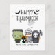 Greet your family and friends with this whimsical, spooky Halloween Greeting Postcard! The design captures the eerie magic of the season. Our design includes illustrations of a cute little scare squad featuring a Frankenstein, a Mummy, a Grim Reaper with his sickle, and cute black cat wearing a pumpkin hat. A group of scary bats are flying overhead the "Happy Halloween" greeting in a fun font and spooky spiders are busy making their spiderwebs. It’s the perfect blend of playful and spine-chilling!