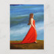 Eine Frau im roten Kleid läuft an einem stürmischen Tag gedankenverloren über eine Wiese.