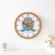 Knights style shield monogram letter D art name simple numbered wall clock perfect for a boys bedroom or playroom in shades of orange, blue white and grey. Personalise with your own name and name meaning for a personalised touch to your child's bedroom or nursery, this example is for names with the letter F. Currently reads Freddy Peaceful ruler. Talented, thoughtful and wise. Ideal for a gift to a new baby boy, for a christening, baby naming or baby shower gift. Unique shield drawing, graphic art, name research, wording and design by Sarah Trett for www.mylittleeden.com