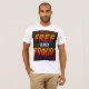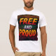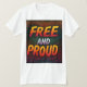The "Free and Proud" t-shirt design features a vibrant, abstract background with swirling patterns and bold lines. The words "Free and Proud" are prominently displayed in a variety of bright, contrasting colours, with detailed typography and crisp, sharp lettering. The design is eye-catching and impactful, conveying a message of freedom and self-expression.