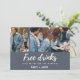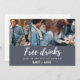Modern wedding save the date cards in a script font with three photo blue design that reads "Free drinks and we're getting married". Customise the front of the card with your photos. Add your names, wedding date and location. Customise the backside of card with your wedding details. Contact me through the button below if you need assistance.