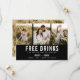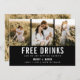Funny wedding save the date cards in a modern three photo black design that reads "Free drinks and we're getting married". Customise the front of the card with 3 of your engagement photos and wedding details. You can also add a horizontal photo to the back.