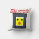 This awesome pillow has a very serious message. The design features a little yellow chick with cute little black eyes and an orange beak peeking out from behind a metal square cage. The text says Free the battery hens. It reflects my personal issues with the way animals are kept and exploited for human use throughout the world.