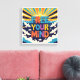 Colourful retro-style inspirational poster with the phrase “Free Your Mind”, designed with a psychedelic 70s aesthetic. The artwork features bold typography, radiant sunbeams, flying white doves, clouds, and vibrant contrasting colours. Perfect for motivational prints, wall decor, or retro-themed designs.