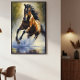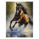 Depiction of a wild horse running through a river, capturing fluid motion and nature’s strength, with water reflections and vibrant tones conveying energy and freedom.