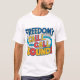 The "Freedom's Call Sounds" t-shirt design features a bold, dynamic graphic of a trumpet with vibrant sound waves radiating outward. The trumpet, depicted in a stylised, modern manner, symbolises the powerful and resonant call for freedom. The sound waves are illustrated with energetic, flowing lines and colours, emphasizing the impact and reach of this call. The design combines elements of musical and patriotic symbolism, creating a striking visual representation of the theme of liberation and self-expression.