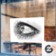 Window clings are a great way of displaying wall art upfront for passersby on their way to the entrance. And this reproduction of my graphite pencil drawing of a beautiful woman’s eye in full mascara make-up is a great eye catcher for the beholder. I did draw this design with fine, detailed lines and a subtle build-up of cross-hatching to create tonal values. This fine art print might delight customers of a beauty salon as much as patients on their way to a routine eye examination on an ophthalmologist’s door.