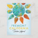 Bright, colourful Fremont California design that is 100% Sunshine approved. Warm colours of red, orange, turquoise and aqua in a watercolor style pattern on a pretty blue shaded background.