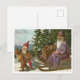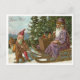Reproduction of an unusual French Christmas postcard from around 1900 with Joyeux Noel and Santa in a purple robe being pulled on a small sled by two elves.