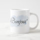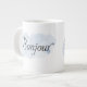 Hello in French - Bonjour in a cursive font with a blue watercolor swoosh underneath.