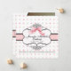 Delicate and demure colour palette of soft dove pastel blush pink, black, white and mint green, this Birth Announcement features elegant French copperplate calligraphy style swirls and scrolls in the background, script flourishes, a bracket shaped frame and a beautiful hand painted ribbon pink bow, with French ruched style satin lace border. All made from original, hand painted watercolor artwork by Audrey Jeanne Roberts. The result is an exquisitely beautifully modern and contemporary Baby ensemble. On the reverse side there is the same damask pattern and a bracket revealing a place for your baby's photo. You can easily add your own picture or change the messages.