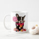 Cute french bulldog in black and white polka dot container with liquorice, candy and big lollipop, designed by artist Maryline Cazenave.