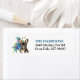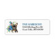 The left side of these return address labels feature a portrait of an adorable black French Bulldog wearing a bow tie. The image is next to a watercolor blue, lavender, and green floral bouquet. Your custom text is in black and matching blue at the right.