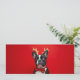 Black and white French Bulldog with red bow tie and golden reindeer antlers, on a red background. The style is fun and quirky.