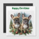 Two adorable French Bulldogs wish Merry Christmas and lie in the Christmas wreath. Everything is festively decorated with globe lights and tinsel. The bulldogs feel comfortable in the Christmas atmosphere.