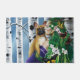 A Dryad holding a brown French Bulldog in a forest of Birch Trees.