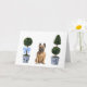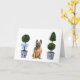 These greeting cards feature a watercolor portrait of a french bulldog sitting in between two chinoiserie style topiaries.