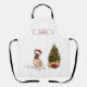 A decorated Christmas tree is surrounded by presents and a red stocking. A cute French Bulldog is wearing a santa hat and bow tie. The dog left muddy paw prints around. Send this gift for the holidays!