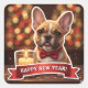 Cute French Bulldog wearing a shiny red bow tie, sitting next to a glowing New Year candle. Bright, photorealistic, and festive Happy New Year sticker.
