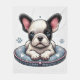 Charming depiction of a French Bulldog puppy resting on a cute heart-patterned pillow. Artistic illustration with vibrant details highlights the dog's lively expression and relaxed pose in a lovely setting.