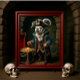 This charming image features a white and black French Bulldog, magnificently dressed as a pirate captain, wearing a feathered tricorn hat and an elaborate blue coat with gleaming gold trim. Beneath, a brown vest with intricate gold details adds to the ensemble. The distinguished canine stands confidently with one paw on an open treasure chest overflowing with gold coins, embodying a serious yet adorable explorer.