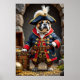 This captivating image features a white and tan French Bulldog, magnificently dressed as a pirate captain, wearing a feathered tricorn hat and an elaborate dark blue coat with red trim and gleaming gold accents. The distinguished canine stands proudly with one paw on an open, antique-looking treasure chest overflowing with gold coins. Its tongue playfully peeking out adds a touch of whimsical personality to this adventurous, regal portrait.