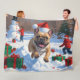 French Bulldog Running in Snow with Christmas Hat Fleece Blanket