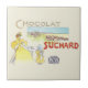 Chocolat Sucard, or Chocolate Sugar, is a great French Chocolate. The antique chocolate scene shows a proper Art Nouveau lady in a big yellow dress sitting at the table sipping hot chocolate. A little girl in a bonnet and yellow dress are standing next to her having a sip of chocolate sucard as well. The Chocolate advertisement's background is a watercolor scene of the French countryside, showing a castletown, and the label says, "Chocolat Sucard". Of course, the French are known for their little outdoor coffee and chocolate cafes -- and it was the same in the Victorian days when people would sit outside, enjoy the air, and have their chocolate.