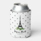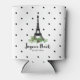 These French style can coolers say ""Joyeux Noël" in modern black typography, and feature an image of the Eiffel Tower surrounded by pine branches and pine cones for the holidays. Black and white polka dots decorate the background, and you can personalise with any name. We have used some art from LABFcreations.