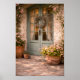 Bring the romantic charm of the French countryside into your home with this French country door wall art print. This peaceful courtyard scene features a vintage blue French door framed by climbing roses, soft greenery, and rustic terracotta flower pots. Warm sunlight and delicate floral details create a cozy European garden atmosphere perfect for farmhouse kitchens, entryways, cottage decor, and reading nooks. The soft neutral tones and classic architecture make this print a beautiful addition to French farmhouse and cottage inspired homes.